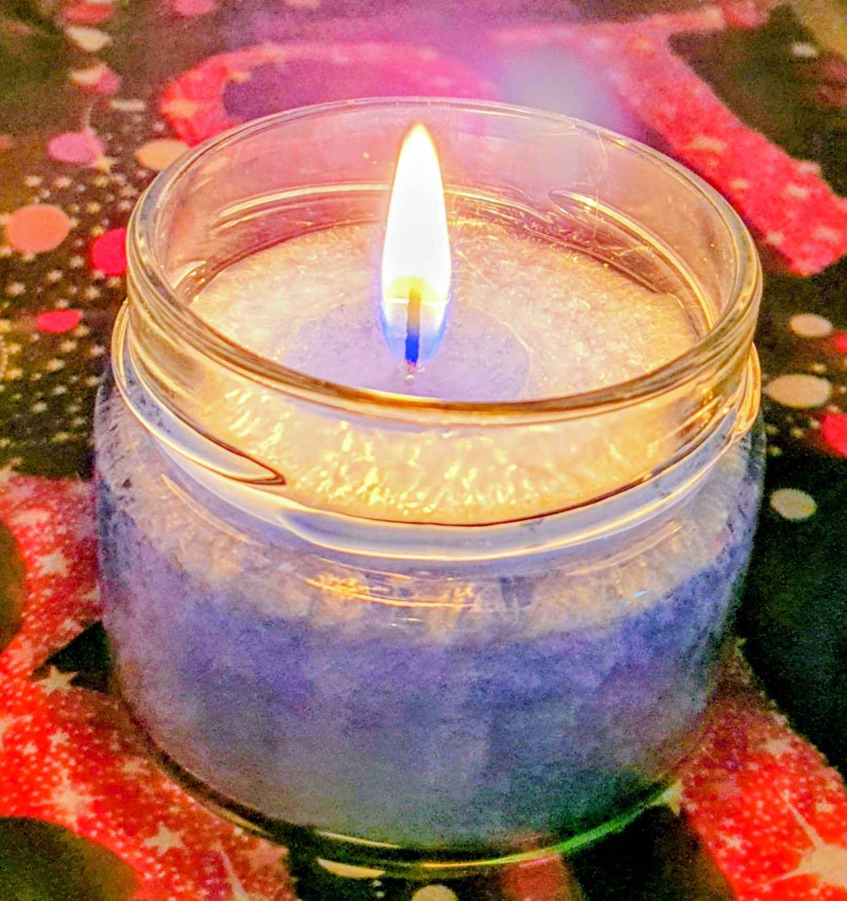 Nahaufnahme einer brennenden blauen Kerze im Glas, umgeben von warmem Lichterglanz im Hintergrund. Die Szene wirkt ruhig, fokussierend und schenkt ein Gefühl von Frieden und stiller Kraft.