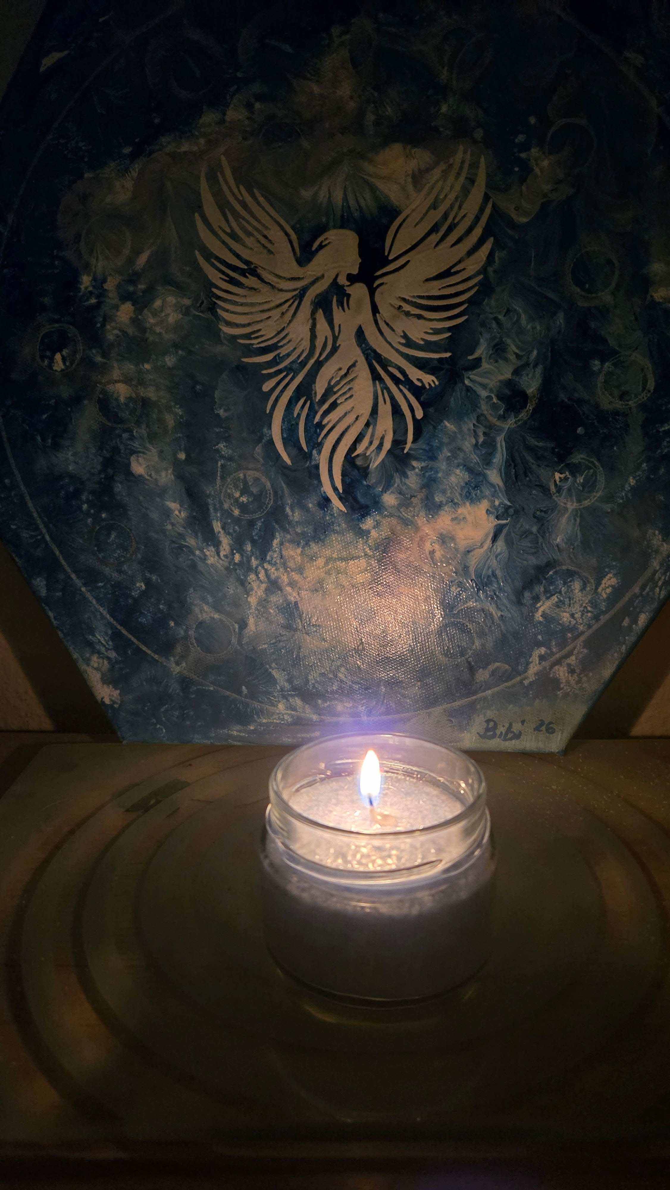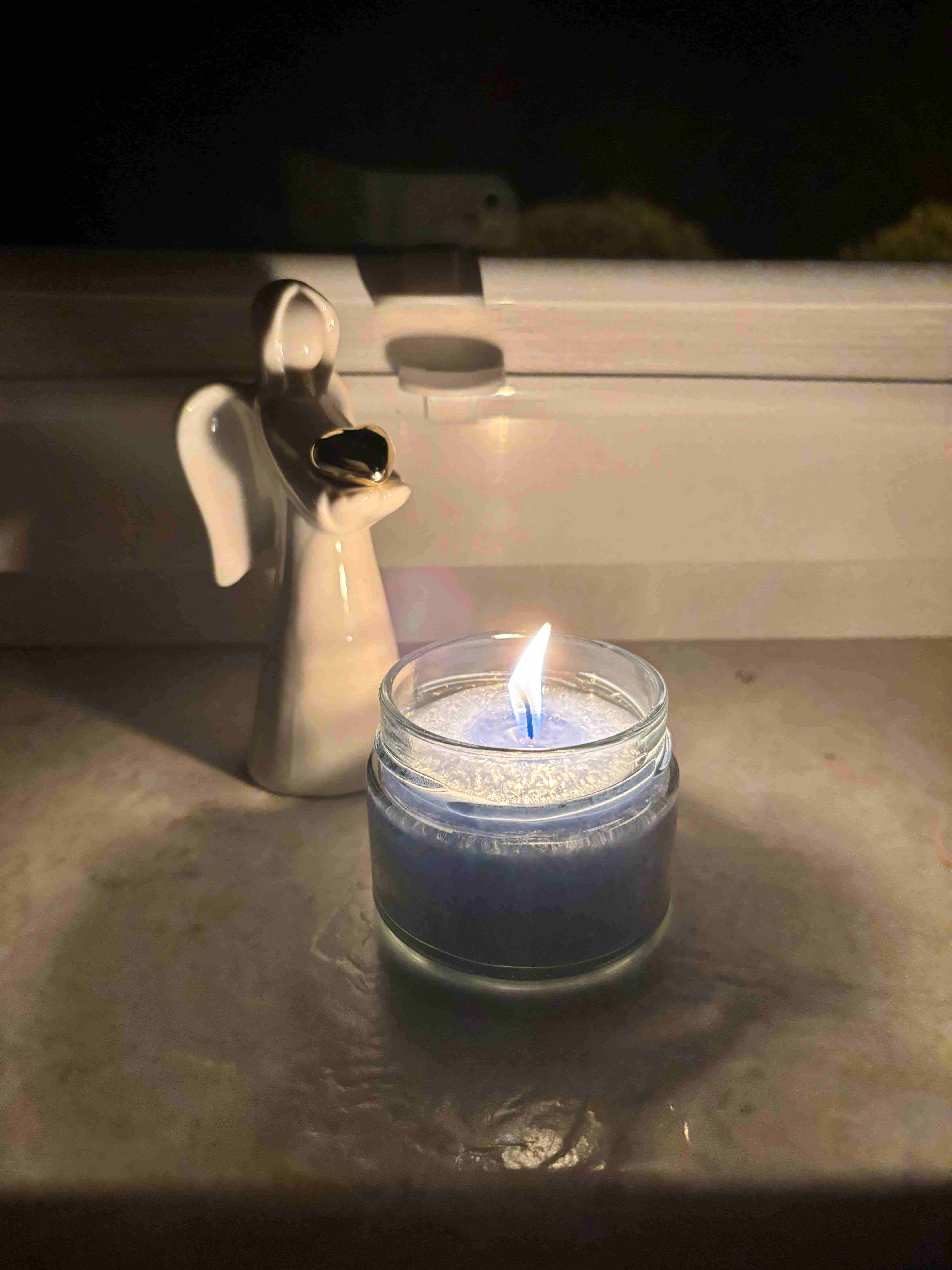 Blaue Kerze im Glas auf hellem Untergrund, umgeben von weißen Federn. Die ruhige Farbwelt und das sanfte Licht schaffen eine friedvolle, klare Stimmung voller Leichtigkeit und innerer Ruhe.