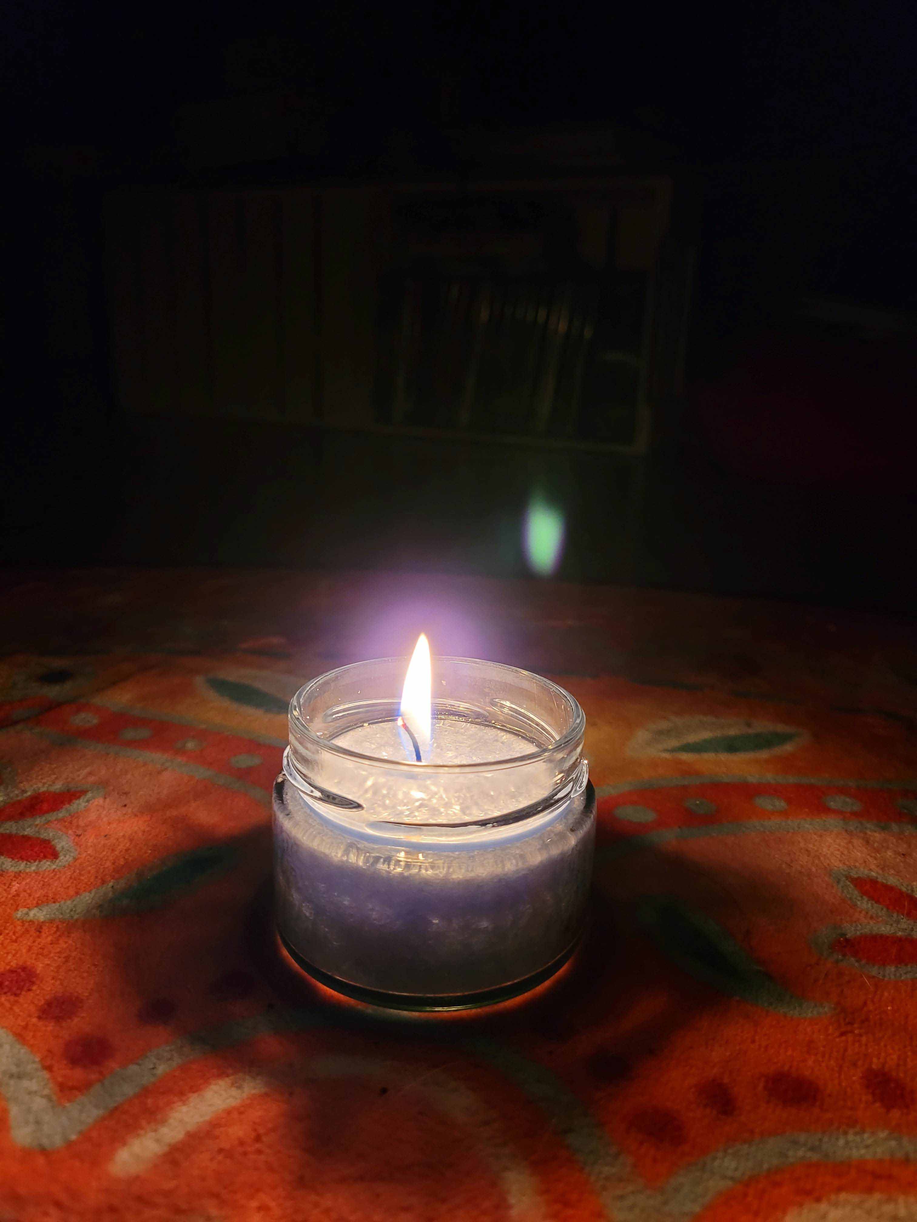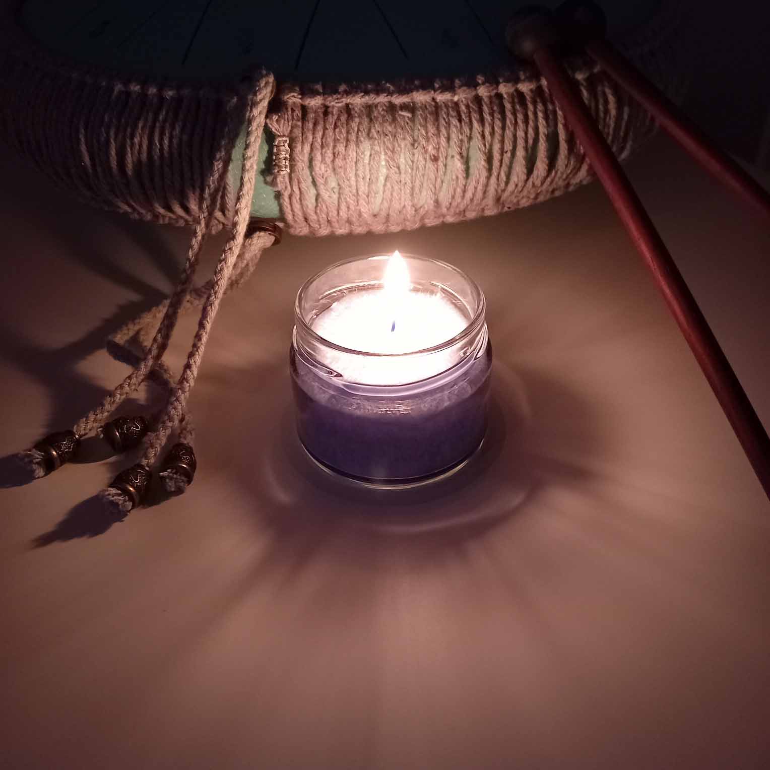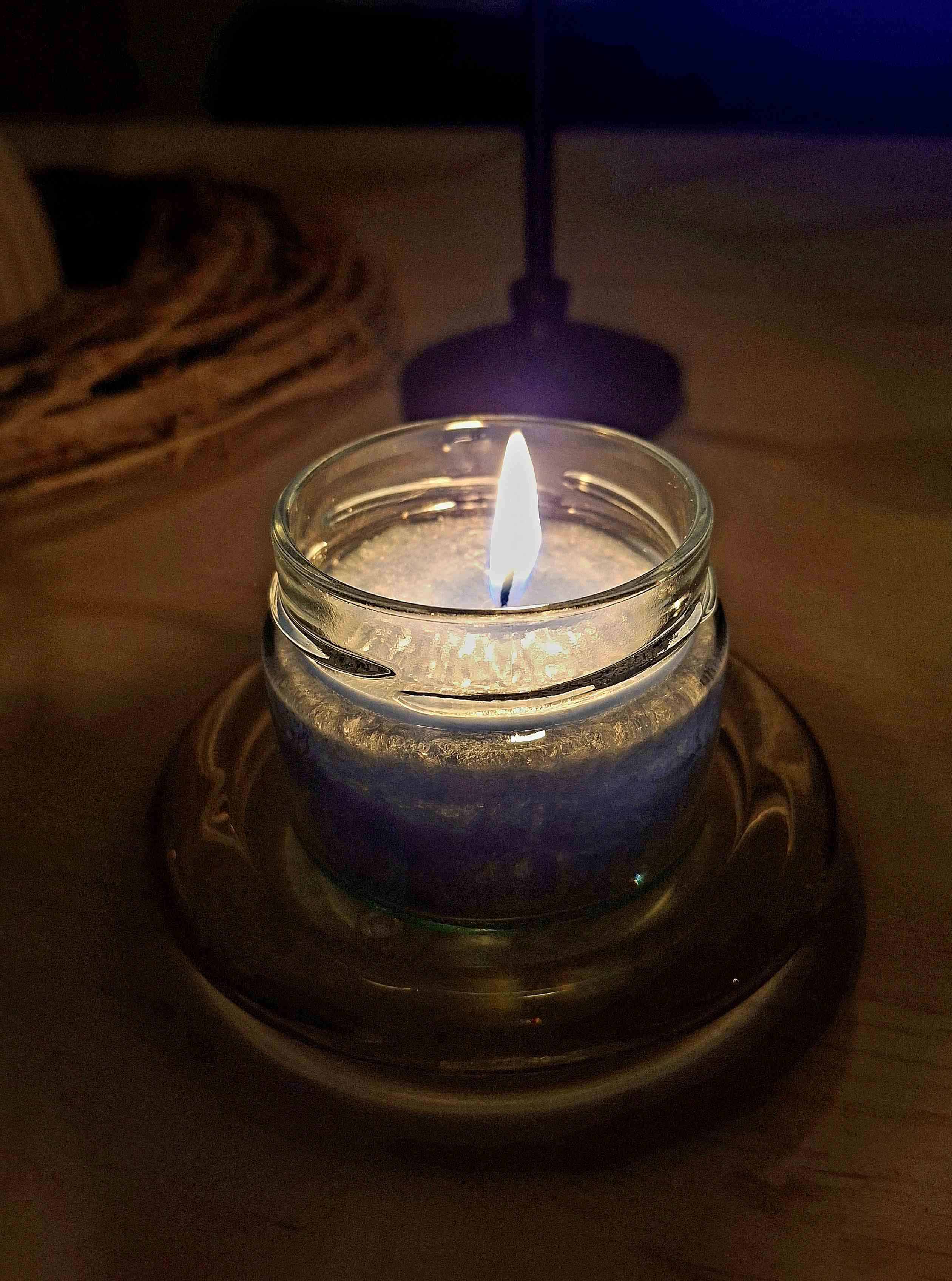 Blaue Kerze im Glas auf einem Teppich, im Hintergrund sanfte Lichter. Die ruhige Abendstimmung lädt zum Innehalten ein und schenkt ein Gefühl von Geborgenheit und entspannter Achtsamkeit.