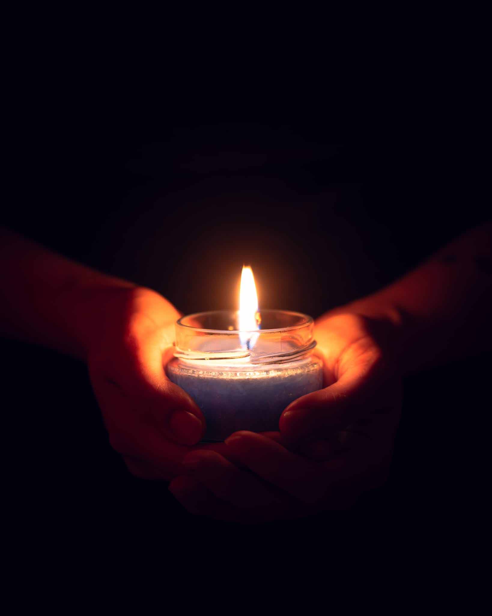Zwei Hände halten behutsam eine blaue Kerze im Glas. Das warme Licht symbolisiert Schutz, Geborgenheit und einen stillen Moment der Achtsamkeit und inneren Einkehr.